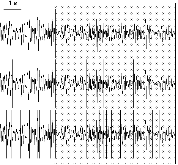change-points are shown against the same filtered EEG. Horizontal scale: 1 s.