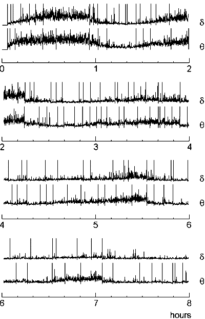 EEG was recorded from right occipital electrode (O2) during 8 h of night sleep with sampling rate 400 Hz and downsampled to 20 Hz. After artefact edition the EEG was filtered in 1--4 Hz (delta) and 4--7 Hz (theta) frequency bands, the amplitude values were squared and then averaged in sequential non-overlaping windows (length 5 s, or 100 samples). The resulting sequences are shown (in each pair the upper curve is for theta band and the lower one is for delta) along with the change-points (vertical lines) detected in them.